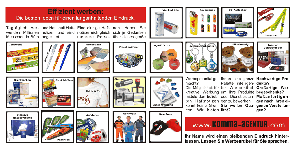 In der heutigen Geschäftswelt sind Werbemittel ein unverzichtbares Instrument zur erfolgreichen Umsetzung Ihrer Marketing- und Unternehmensstrategien. Wir planen mit Ihnen Ihre Veranstaltungen, Aktionen und Messeauftritte.